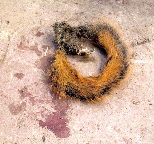 I found that one of the cats had enjoyed a meal of squirrel sushi in here. |
