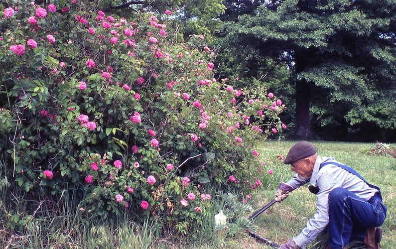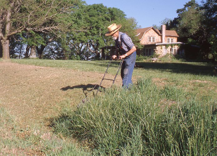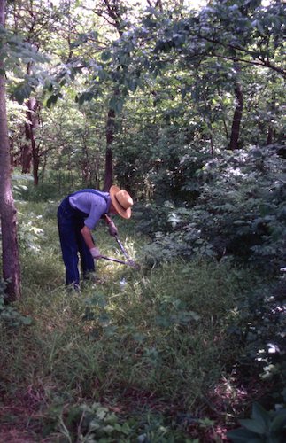 Mowing the north bank, too steep for a riding mower. |