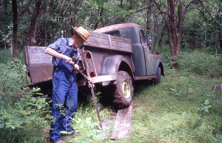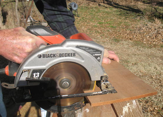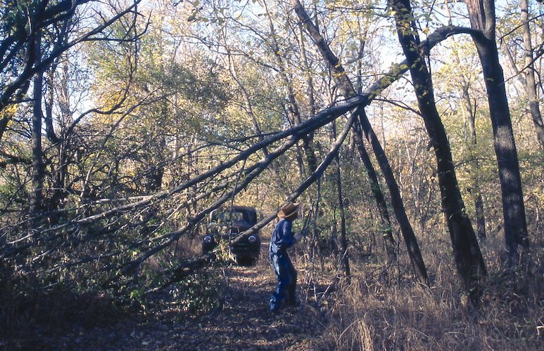 Cutting little trees out of the brush pile road. |