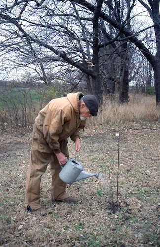 Watering new seedlings: American sweet gum and red maple. |