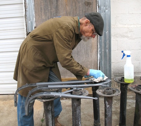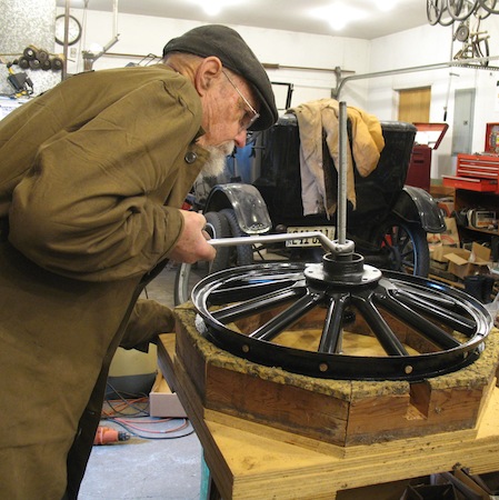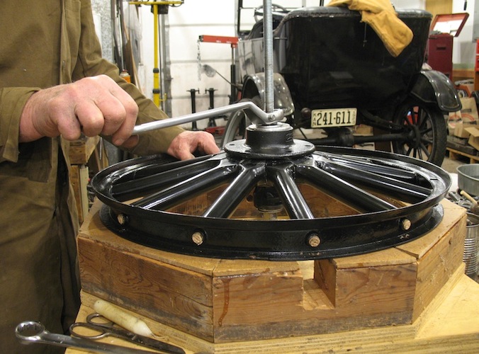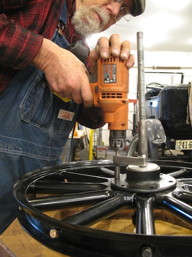 Odds and ends. I finished painting the spare tire carrier for the touring car, and the new splash apron. I ground smooth some gouges inside an axle housing, and cut a slit in a top socket where it was a bit thin. The slit will be MIG welded and ground smooth to strengthen the thing. I went to town in the runabout to mail a couple of hubs to a T guy in New Jersey. He plans to use them for a pair of new front wheels for his 1914 touring. |