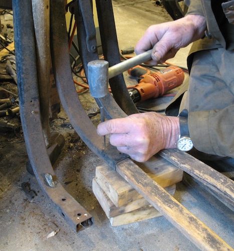 Creeping along toward actually finishing something, today I unriveted the replacement socket for the left side of the car. Maybe tomorrow I can detach the mangled one it's going to replace. I spent a couple of hours working on my wheel press. Originally I padded it with foam rubber, but the felloe should be free to slide so it will be centered. So today I removd the foam rubber and replaced it with masonite. As it turned out, in the end I had to put blocks under the felloe so the hub could be pressd down far enough to make the wheel straight. Next will be drilling the holes ahd bolting on the hub plate. |