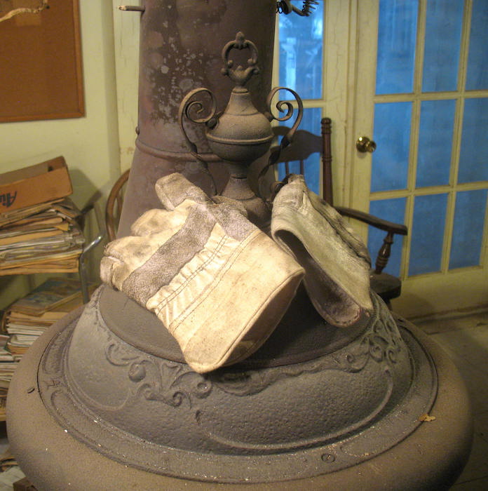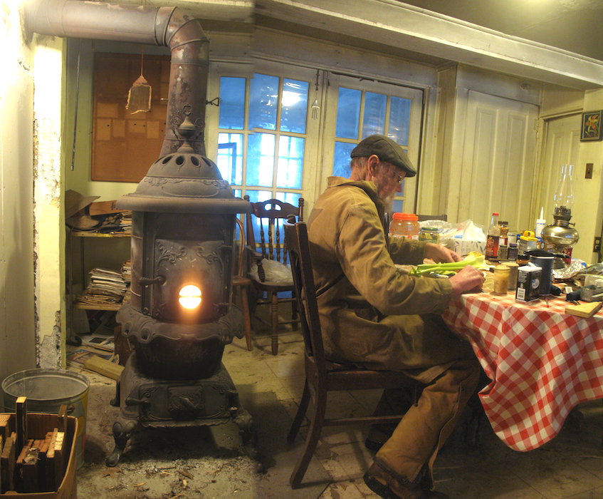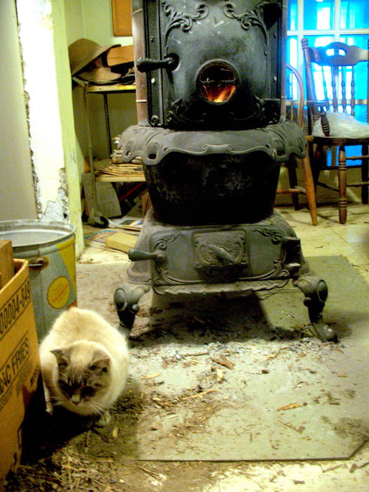 As planned the first thing I did in the morning was get a fire going in the kitchen. The inside temperature, even with the little electric heater running 24 hours a day, was right at 32º. The thermometer outside the window read 4º. For breakfast I was warm and toasty, but after I left and the fire burned out, how long would the room stay above freezing? At two in the afternoon I went back to the house and checked, and it was OK — 35º. At that time the thermometer outside the north window of the shop read 2º and was shaking in the wind. The snow started in the wee hours of the morning and quit in the early afternoon. I think it amounted to about three or four inches. By four the kitchen was down to 32º, so I started the evening fire a little early. I'm burning up firewood at a pretty fast pace, so I think I'll skip TV for a few days so I don't have to heat the living room I don't want to use up all the wood stacked in the garage while all the wood outside is buried in snow, and I really don't want to be out gathering more while the temperatures are in single digits. |
