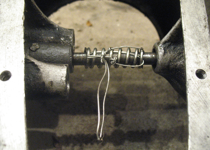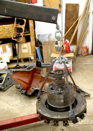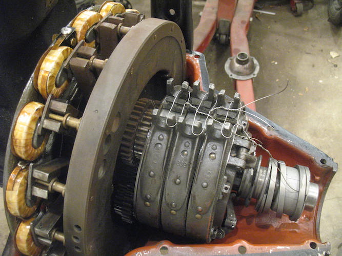 When I stepped into the shop this morning it felt kind of cool. I checked the thermometer on the wall and it showed 60º. I have the thermostat set at 68º, so obviously the heater wasn't working. I flipped the switch off and back on and the fan blew for a few seconds and shut off without the burner lighting. This has happened before, so I had an idea of what to do. I pulled off a little vacuum hose and stuck a wire into the tube where it attaches, removing the little bit of dirt or spider web or whatever was blocking it. I reattached the hose, turned on the heater, and it fired right up. With any luck I won't have to do that again until next year. My work in the shop today was installing the transmission bands and tying them in position for putting on the hogshead. The hogshead (transmission cover) has the low pedal shaft in it, so I had to compress the spring on the shaft so it will fit between the low band ears when I set the hogshead in place. I should get that done tomorrow. |