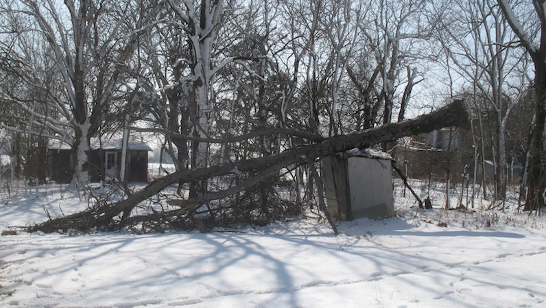 Last week's weather brought down a rotten old pine tree in the yard. I had been wondering how I'd bring it down without hitting a building, but the storm settled that question. The old privy is a little worse for it. By today the snow was almost all gone, and I'm running low on firewood, so this afternoon I fired up the chain saw and started turning big pieces into smaller pieces. There's a lot of wood there, so maybe it will finish the burning season. The weather will be warming up, and there will be more and more nights when I don't need a fire. |