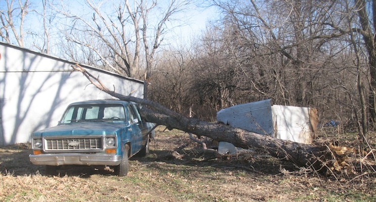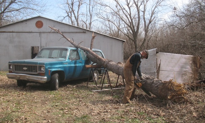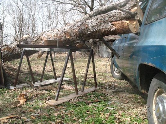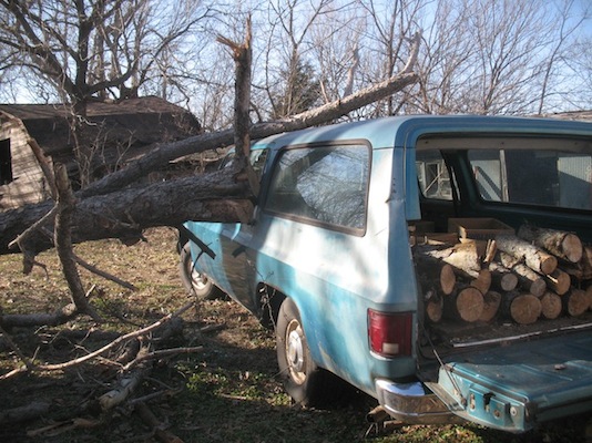 | Wednesday, March 6, 2013 It dawned on me that I had steel sawhorses and a piece of heavy square tubing, so I didn't need to build anything. I placed the sawhorses parallel to the log and laid the tubing across them. Then I clamped on a couple of blocks to keep the trunk from rolling and I was set. All I had to do then was saw off a piece of the trunk near the base, causing the lower end to settle to the ground and raising the upper end. A couple of cuts raised the upper end enough to let me drive the car away. One day soon I'll get estimates on body repair and new glass. Today's other chores were working on the license plates some more, shopping for dog food and cat food, mailing a roll of film for developing, and cutting and splitting some of that fallen tree for firewood. I also got on the phone to California and ordered some copper crush washers for Champion X spark plugs. It was a busy day. |
