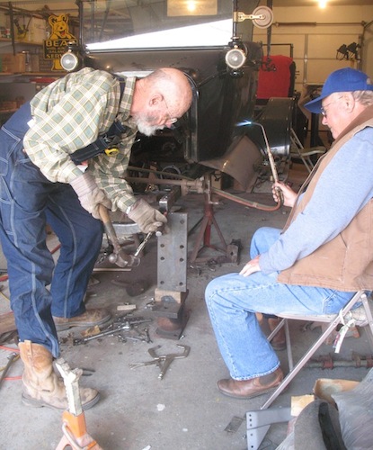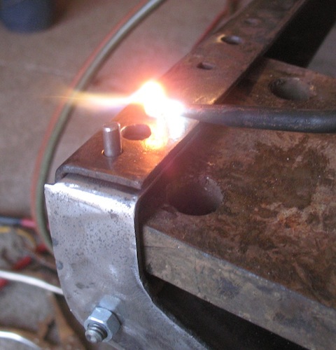 Today's main project was installing the roadster's new front cross member. Dave Rademacher had a day off and came over to help because this is a job for at least two people. One person heats the rivet and the other mashes it. I thought this job would take us a couple of hours, but it took a little more than four. We got better at it as we went along, and I think we did a pretty fair job for a couple of novices. In