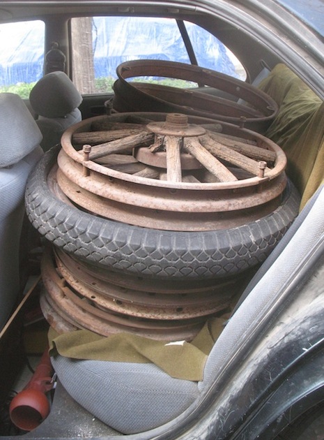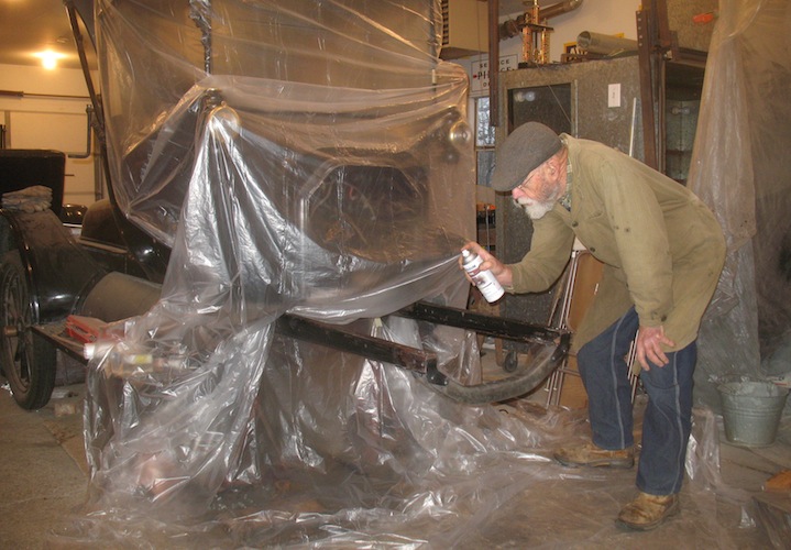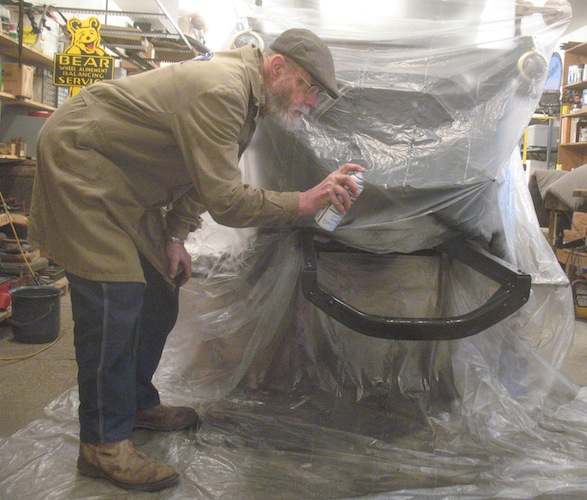 March 18, 2013 Job One today was frame painting. I applied a couple of coats and most of it looked pretty good. There are a couple of rough spots I'll sand and repaint after the paint has had a few days to dry thoroughly. With the painting done, I took the carburetor off my sick touring car and cleaned it out. When I reinstalled it and took a test drive I found the car still lacked some of its normal power, and when I got back the radiator was boiling, so I have more detective work to do on that case. There's rain in the forecast for later in the week, so I fired up the splitter and turned big pieces of wood into smaller pieces, and put them in the garage to stay dry. |