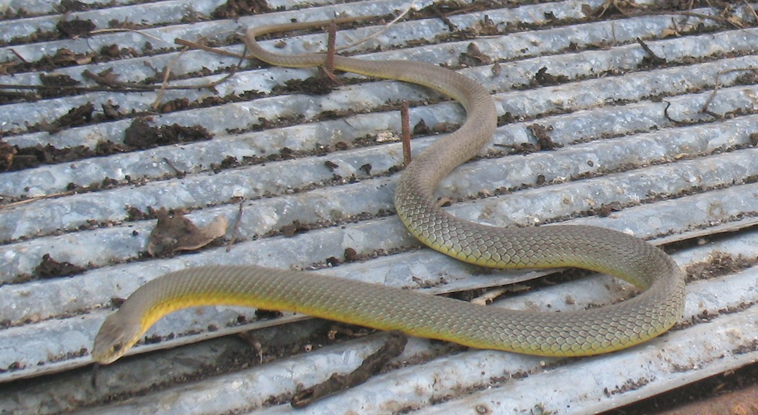 A little of this, a little of that. I assembled the roadster's new upper windshield frame and took it to Winfield to have the glass installed, bought a couple of quarts of kimchi, and stopped at the Wal-Mart to buy two gallons of ATF which the so-called super center in Arkansas City doesn't carry. When I got home I unloaded the mower out of the Suburban, adjusted the transmission, and spent about an hour mowing. Next was getting ready to start a combination project. Part of it will be taking the TV cable which is currently strung across the back of the house and running it underground and into the house through the cellar. The underground part will be in front of and into the garage. It will need to be deep enough to be under the other part of the project, which will be excavating in front of the garage to carry away rainwater so it won't flood into the garage. I aim to make it a wide and shallow trough and pave it with bricks. All I did on it today was raking away all the twigs, leaves, and other debris where I'll be digging. Next was a session of cutting inconveniently placed little trees and dosing the stumps with Tordon. The last job of the day was dealing with old roofing. When putting new corrugated roofing on the east end of the shop, I tossed the old stuff in a haphazard pile. Today I got around to stacking it neatly, and found that it was quite a snake haven. I found a good sized black snake, about three feet long, which I'm always glad to see because they eat mice. There were two or three little prairie ringnecks, and this handsome critter. From what I found online, I think it's a yellow belly racer. |