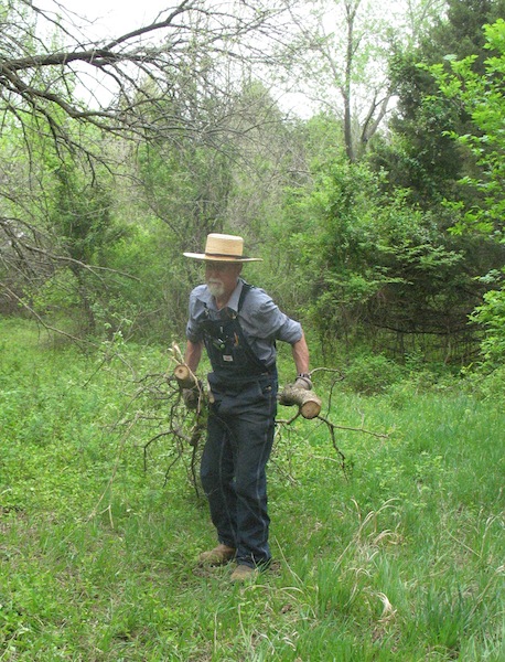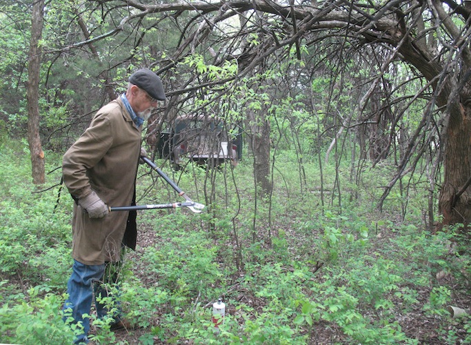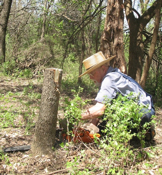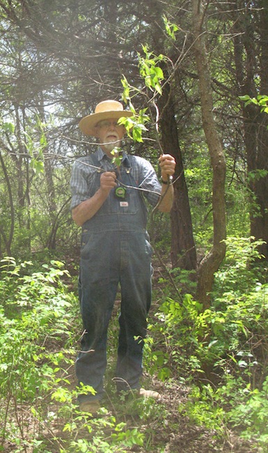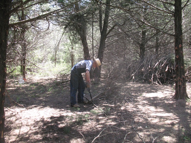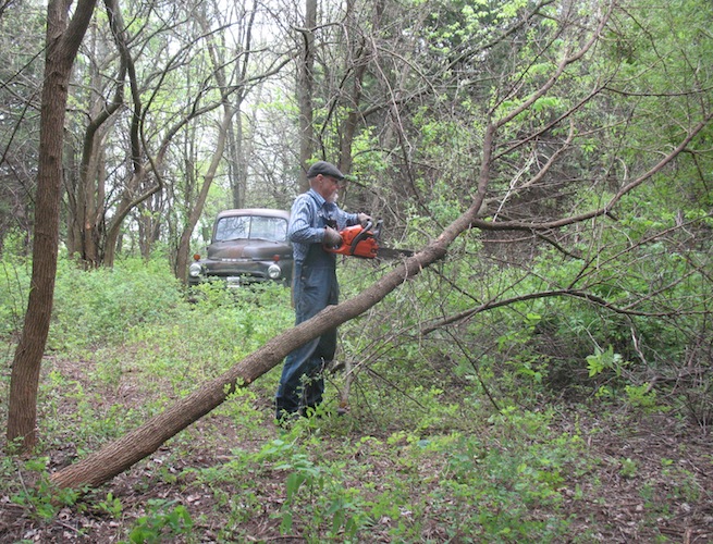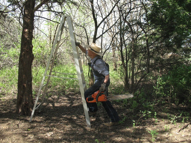 More work on the new road today. I spent about five hours on it, and completed all the branch trimming and removal of small trees across the south end and starting up the east side. I also took out one tree that wasn't so small. It had a trunk about eight inches at the bottom. I'm able to route the road around most of the larger trees, but this one was in a spot where it just had to go. It will be part of next winter's heat. Where I have to get by eastern red cedars there are a lot of branches to cut off, but there are no smaller ones under them for me to remove. |