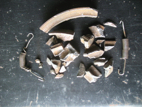 My Model T wheel puller arrived today, so when I got home from work I pulled off that sticking wheel. Inside the drum I found brake shoes broken into big and little pieces. As bad as this looks, it will be a lot simpler to deal with than a bad rear end or transmission.