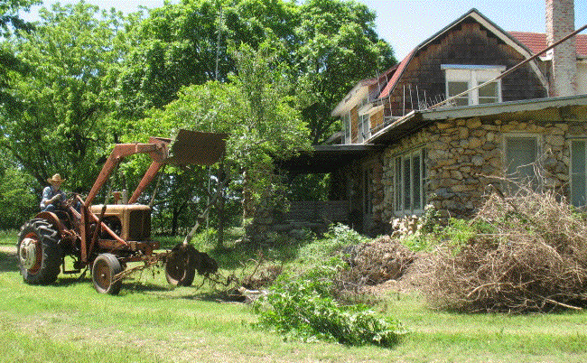 A sunny day was the occasion for some overdue yard work. I removed a huge tangle of dead honeysuckle vines I had poisoned last fall because they were threatening to take over the place. That's the big pile of stuff on the right in the picture. Then I brought the WD around and pulled up a couple of trees that had come up in unfortunate locations too close to the house. I also spent an hour or so cutting off little trees and doping the stumps with Tordon. After all the yard work I went grocery shopping, then put the final coat of paint on the TT steering column. It was nice to actually get some work done.