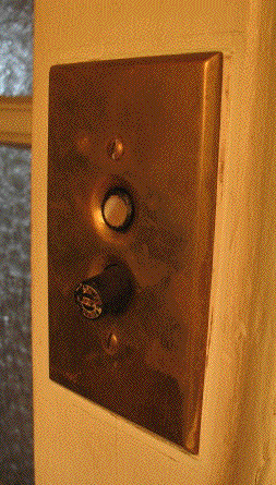 When I got home from town, about 10:30, I went back to work on the brakes. I finished cutting off that bent cam, and put the shaft in a vise so I could drive the pins out and remove the lever. Nothing moved, so I heated the thing until it glowed, let it cool, and started hammering again. The heat did the trick for half the job; I got one pin out. The other pin still wouldn't budge, so I applied the torch and turned the thing orange again. When the piece was cool enough to work on, I found that the electric power in the barn was off. Further checking revealed that the power was off everywhere. So I decided this was a good time to do a project that's been waiting quite some time. That is replacing some of the light switches in the house. I'm installing old time push button switches. Actually those were used before this house was built, and were passe by the time it was electrified in 1935. But I think they're a pretty neat item, so I'll use them.