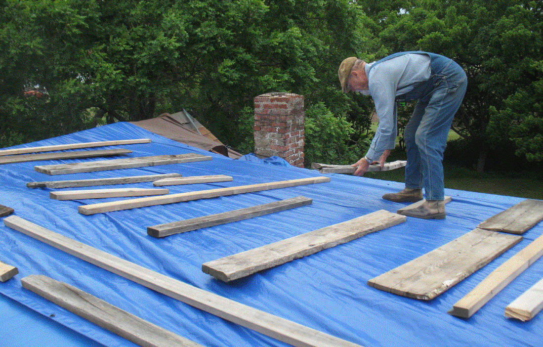 The bullet just grazed my skull. A fast moving storm blew in with high winds and ripped the front tarp loose, then the rain started. I dragged the mop bucket upstairs and started mopping up the water that leaked in. But the storm was moving so fast that the rain lasted only a few minutes. As soon as it was over I got up on the roof to assess the situation. The wind had ripped the grommets out of the south end of the tarp, so I laid lath atop the edge and nailed it down. Part of the adventure was a power failure, so I ate dinner by kerosene light.