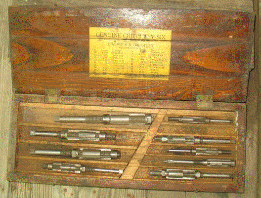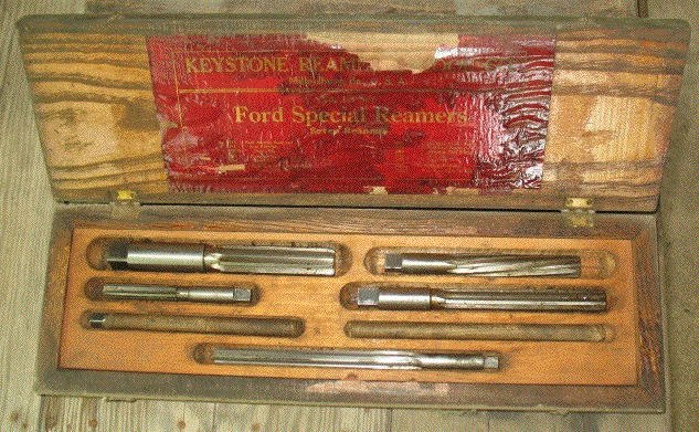 This morning I got out the chain saw and cut up branches I had trimmed and piled in the yard, and had time to get most of the wood hauled in before I took off for another auction. I really didn't intend to stay long. From the advertising I thought there were only a couple of items I'd want. When I first looked at the stuff for sale that seemed right. But as the sale went on I found more. Some items sold a lot higher than I would have paid, but a lot of things went cheap. My bargains included a Model T era running board tool box with no dents for $7.50, a 3/4" socket set for $3, four cans of galvanized nails for 50¢ each, a pile of miscellaneous stuff that included several oil cans for $1, a standing drill press for $25, and two sets of Model T era reamers for $35 each. I watch for galvanized nails, especially roofing nails, at farm sales because the old ones are hot-dipped galvanized. The new ones you get at the hardware store now are electroplated and turn to rust spots in a couple of years. The two sets totaling 17 individual reamers were an especially good buy, as a single new reamer can cost $50 to $100.