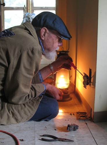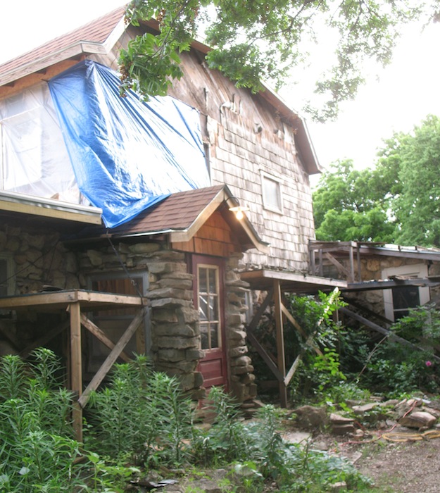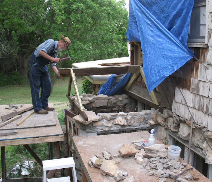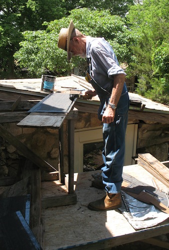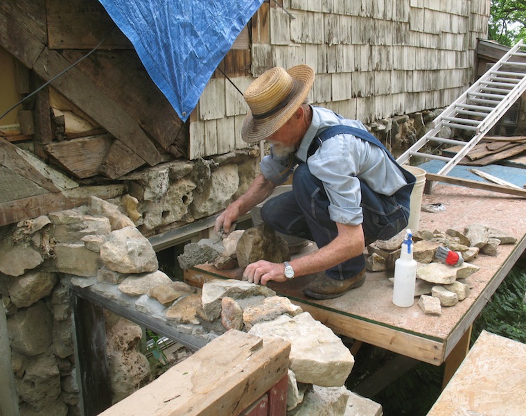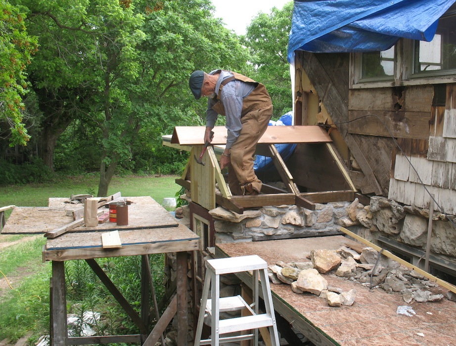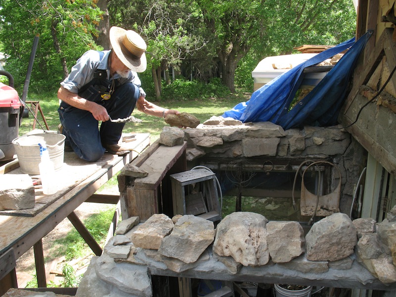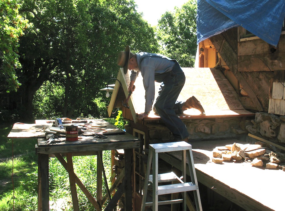 On a lazy Sunday morning I got off to a late start, checking email and websites. About ten I got outside and spent a half hour watering all the new plants, then got back to work on the back porch project. I replaced a stone on the east side and laid a whole row of stones over the window on the west side. I hope to be done with all the stone masonry in a few days, then I can get busy building the new roof on top of it. I'll be happy if I can have the new roof finished by the end of the month. I ended my masonry for the day about two, made a trip to town in the roadster for groceries, then did a little movie project. In reply to a request on the Model T forum, I made a short video on using the Ford screw jack. |