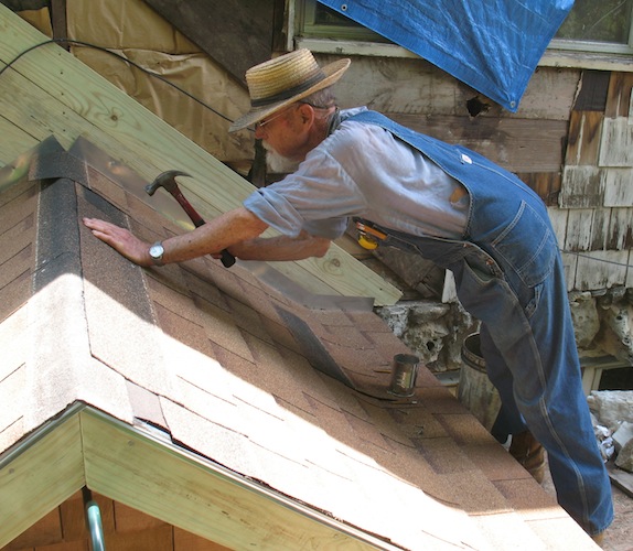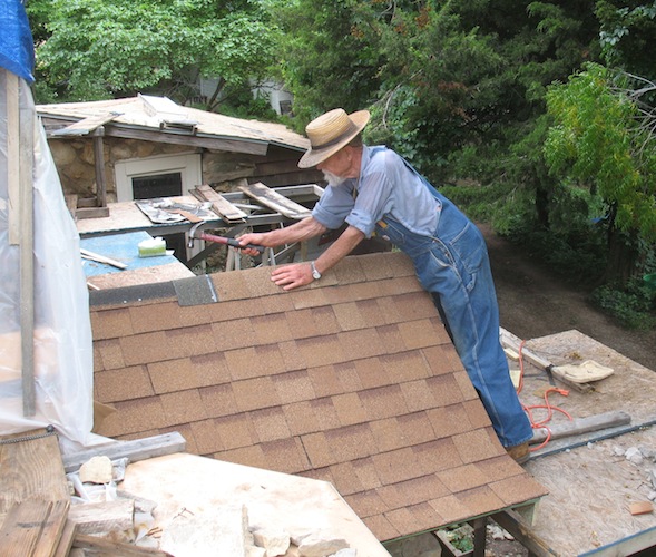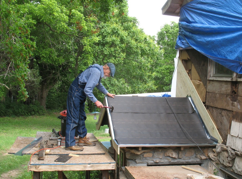 Tuesday, May 26, 2015 Almost done. I would have finished the shingles today, but about four in the afternoon ominous thunder to the north and ominous thunder to the south and dark clouds overhead told me it was time to quit for the day. With tools put away and tarps back in place one more time, I retreated to my shop and cut the shingles that will finish the job tomorrow. With that done the scaffold blocking the back door will come down and I'll finish the new window frame and reinstall the window. And with that done, it will be past time to break from working on the house and get some yard work done. |