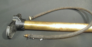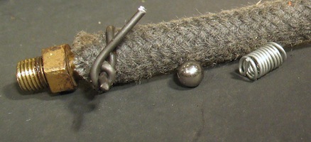 May 23, 2015 On another wet day I worked indoors again. I spent a lot of time in the shop working on a Ford tire pump. It was missing a check valve, so I went to the bike shop and got a ball bearing that would fit into the hole where the valve should be. I made a new leather for the pump and installed it, put the ball into its place, screwed on the brass outlet fitting, and tried it out. Each downstroke blew the ball up against the outlet fitting and sealed it so no air could get out. Obviously something else was needed. I made a little spacer coil from a bit of wire to keep the ball from reaching the bottom of the outlet. That worked, but only for a low pressure effort like blowing up an inner tube. The ball isn't quite big enough to fully close the seat, so when I hooked up the hose to an actual tire the air from the tire blew back past the ball. So I need to come up with a better check valve. |