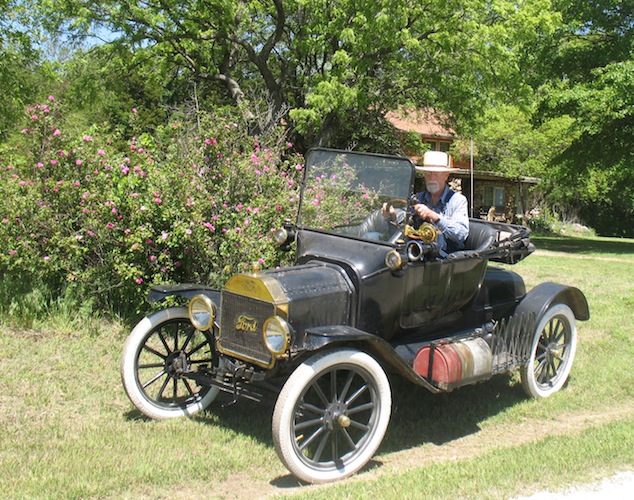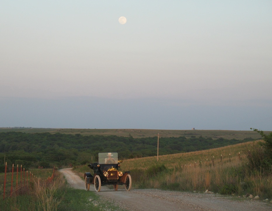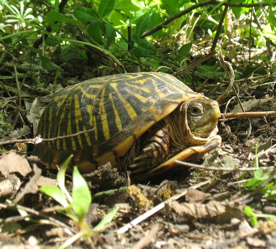 Yard work, all day. I did a lot of mowing, then tackled small tree removal along the west drive. That's a job that's needed doing for a long time, and there are a lot of little trees that need to go. While mowing I noticed that the rose bush out by the road is in full bloom, so I brought the roadster out to sit for a portrait with the roses. While working on tree removal, I came across a painted box turtle, the offical Kansas State Reptile. |