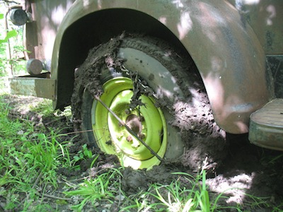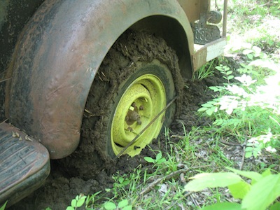 May 7, 2017 I gambled and lost. A walk down toward the south brush pile made it obvious that was a no go. The road was not only muddy, but had water standing in it. The new road I just finished looked better, so I gave it a go. A couple of dry days weren't enough. The ground is still too soft. When the wheels dig in this deep, even tire chains don't help. For now I won't even try to get the truck out. I'll give it another few days, but I won't be hauling any yard trash after I get it out, probably for several weeks. I'll just make piles in the yard and haul them later when the ground has dried out. So what did I do with the rest of the day? Went to town for groceries, changed oil in the roadster, took a nice nap, and removed more little trees by the west drive. Killing so many small trees, I'll have to buy another bottle of Tordon tomorrow when the co-op is open. |