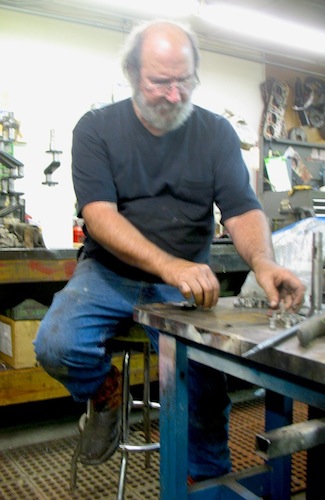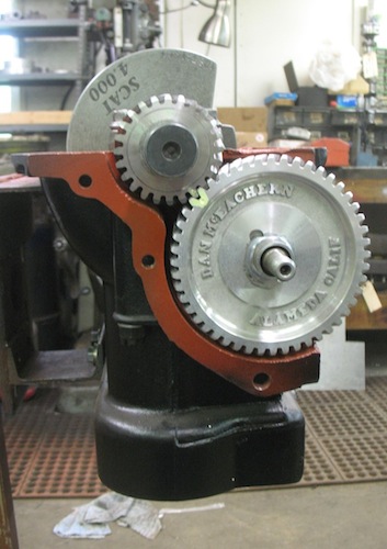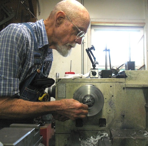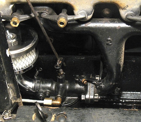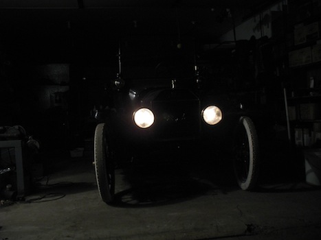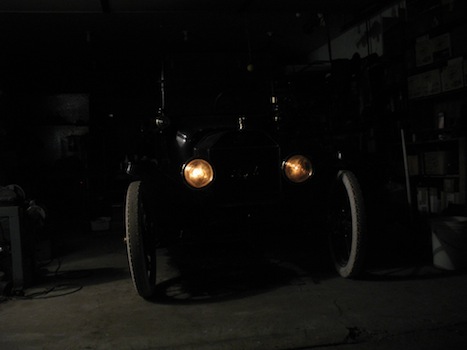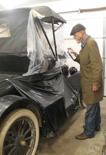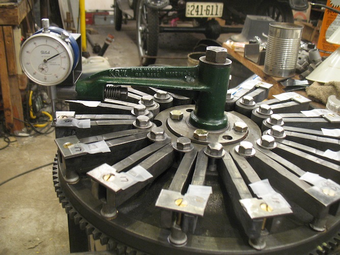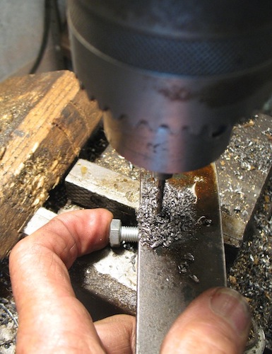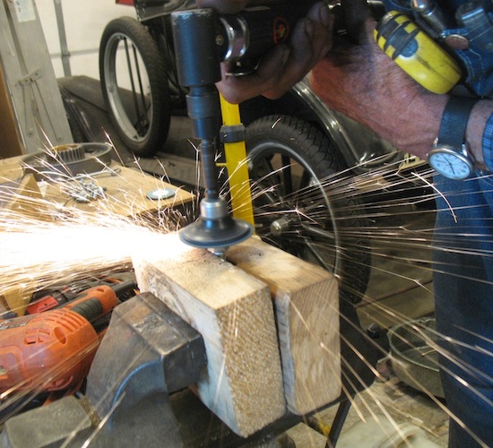 The first job of the day was painting the new rivet I made for the roadster's top, and touching up the top irons. Next was inspecting the car and checking off items on the MTFCA inspection list. When I got to the hand brake control I found that it was attached by the wrong nuts and bolts, and I set about making correct ones. I made a drill guide and put holes for cotter pins in 32 bolts, then ground off the modern markings, stripped off the cad plating, and prepped the bolts and some castle nuts for painting tomorrow. |