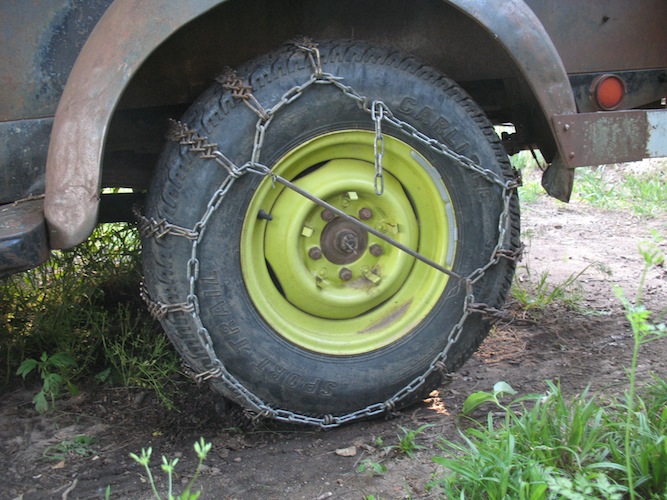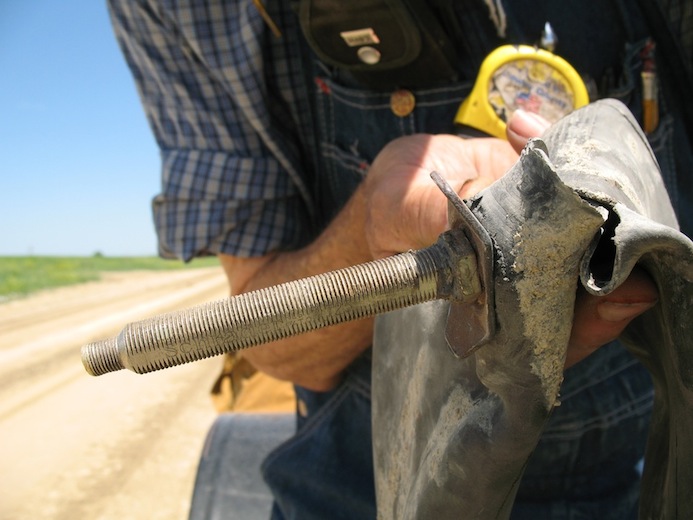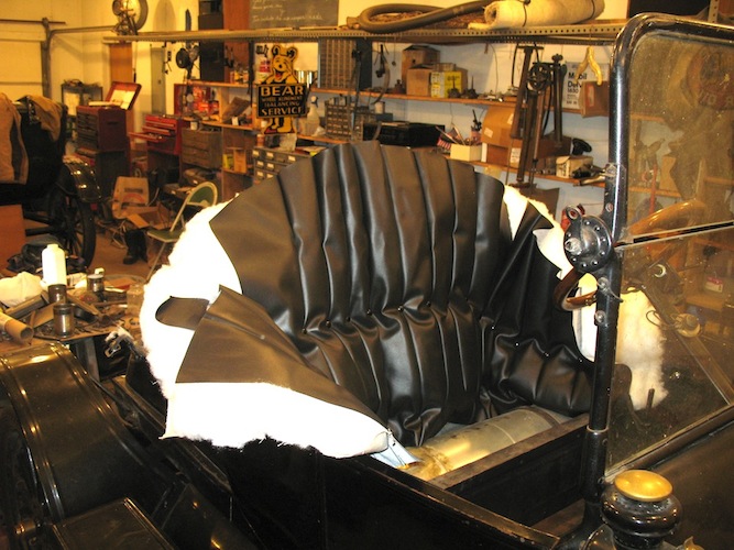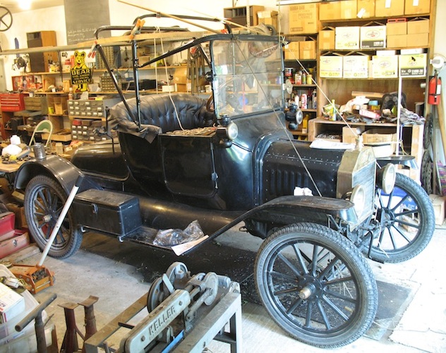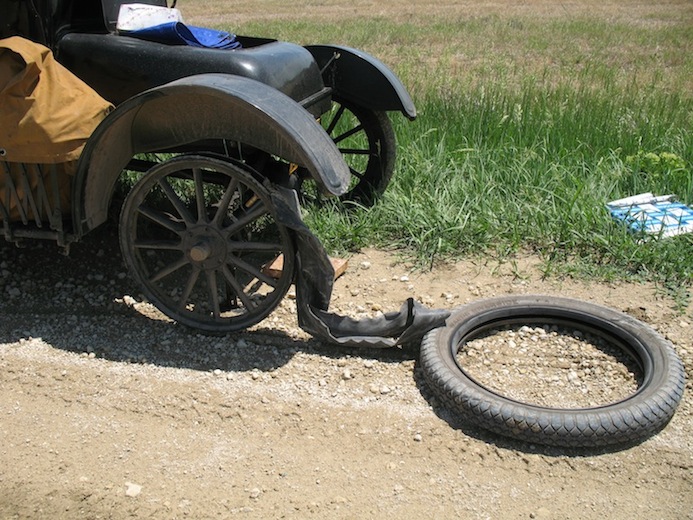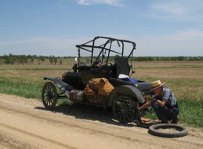 I'm off to Concordia for the Flatland Model T's spring tour. I was late getting away, and didn't leave home until 8:25 AM. As I approached El Dorado, about sixty miles north, there were rain storms ahead. Fortunately, they moved on east and I just got a few drops. With my new top not yet finished, I stopped to clamp on a tarp, but the drops quit before I even got the tarp out. That was the last threatening weather, and the forecast is for clear skies all weekend. After stopping for gas in El Dorado I continued on north through Butler and Harvey Counties and into Marion County, and that's where the first big adventure of the day occurred. It's always disappointing when you see one of your tires go rolling up the road ahead of you. In this case the tire was OK, but the tube was toast. The replacement is a rubber-stemmed Indian tube, and the stem is barely long enough to reach through the felloe. I was lucky enough to have some help. A local guy stopped and took me up the road to his farm so I could fill the tire with a compressor and not have to use the foot pump. As it was, I spent an hour and a quarter on this unscheduled stop. |