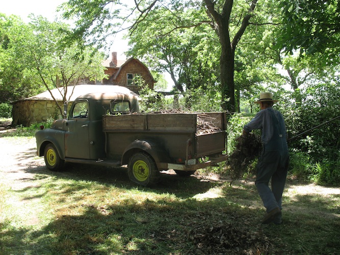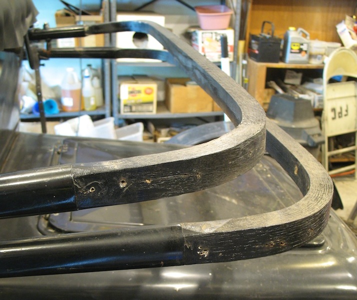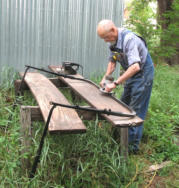 It was Auction Day again, and I drove up to Udall hoping to come home with a working router. There was one in the sale, but I dropped out of the bidding when it got up near the price of a new one. I did buy a good web chair for $1, and over 200 bricks for $15. I brought the chair home, but I'll go back with a trailer to fetch the bricks. On the way home I stopped in town and borrowed a router from my cousin Wally. I finished work on the top bows to the ominous sound of thunder, and felt the first drops of rain as I was putting the tools inside. |
