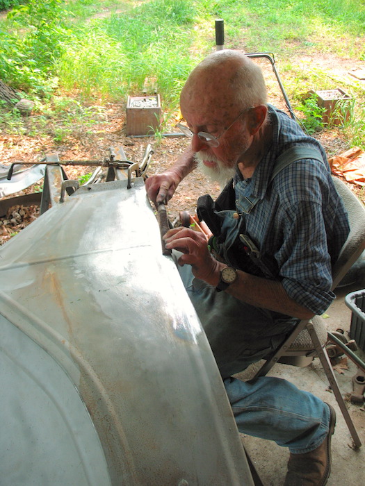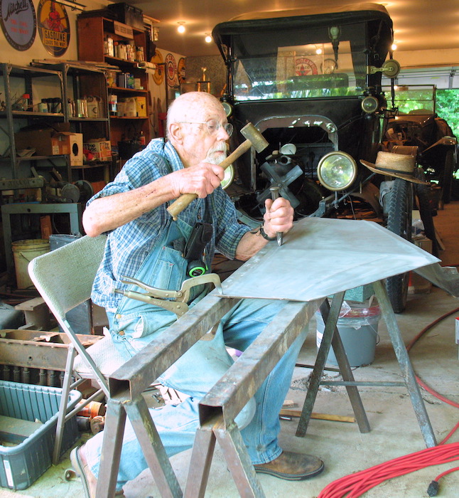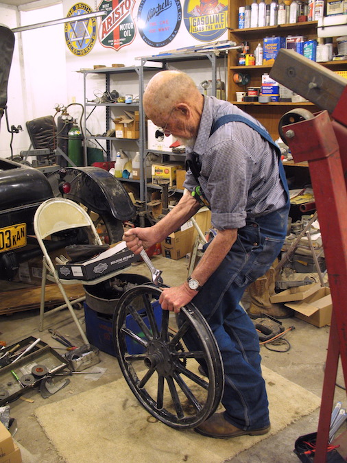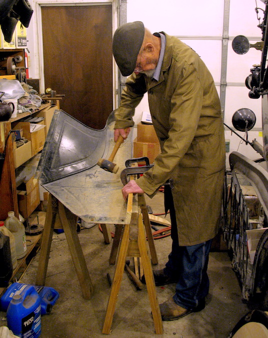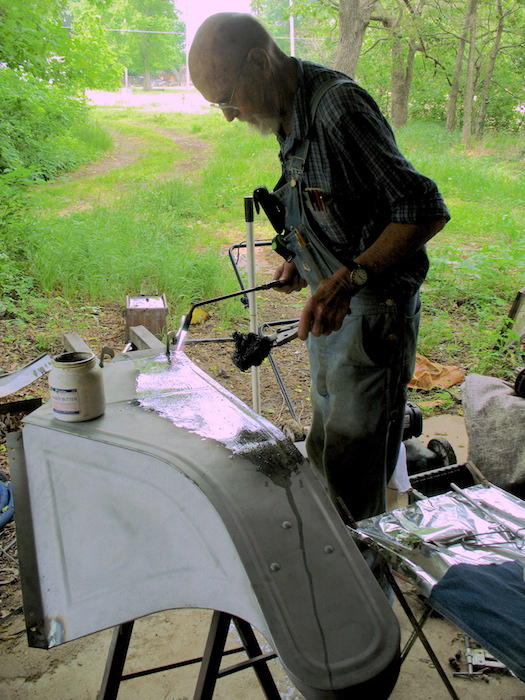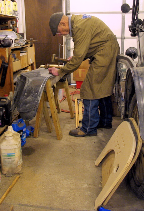 I'm not an experienced body man, but I spent another rainy day inside, pounding on a bent fender. I got it straight so it doesn't pop back to bent. Next will be to finish sandblasting it, then applying body solder. My other Model T job was straightening out the dings on a front wheel rim. Said dings were the result of throwing a tire and running on gravel for a couple of hundred feet last September in Chautauqua County. The lesson: check your tire pressure and keep it up. |