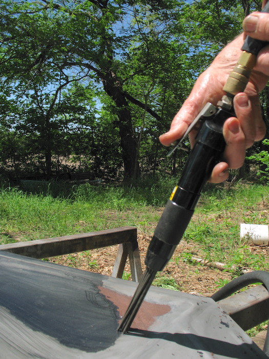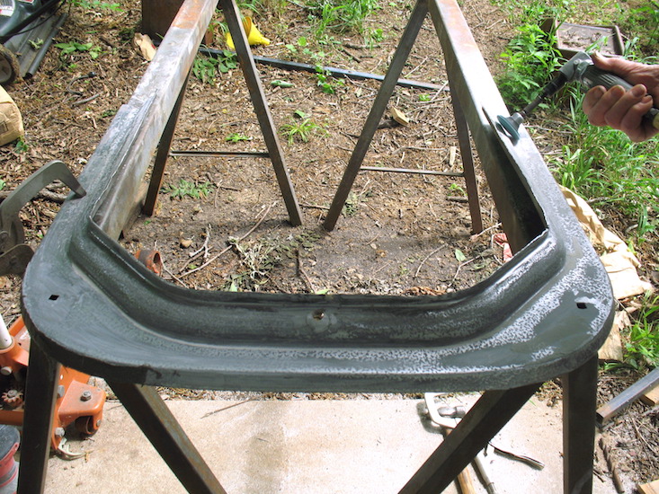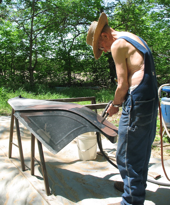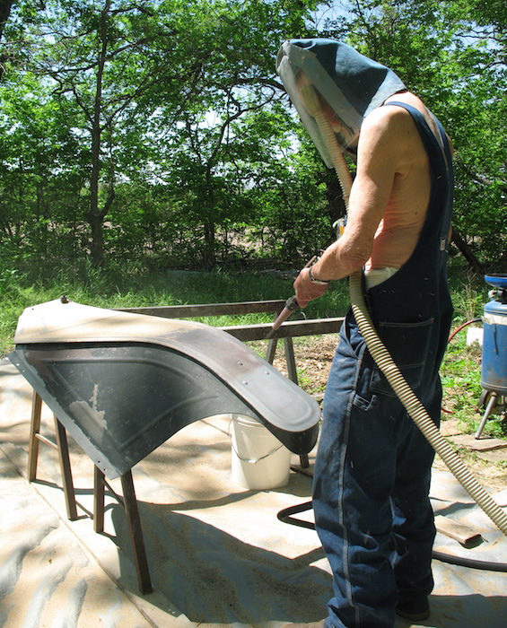 Saturday, May 7, 2022 Since January, most mornings I've been doing one third of the Marine fitness test: crunches (sit-ups). The passing score for men over 46 is 40, and I usually get up to the low forties. I quit running because of a hip starting to go south, so that third of the test is out. The minimum for the last third, pull-ups, is three. I can't do even one anymore, so I've been doing 100 curls with a seven pound window weight in each hand, hoping to regain some of my lost upper body strength. I believe I'll start doing those 100 curls two or three times a day and see if I can get back enough strength to do a pull-up. After exercises and breakfast, up first today was a drive to Winfield to check out the Defore and Patterson auctions. Neither one had anything that persuaded me to stay. At home I did a bit of spraying to murder unauthorized vegetation, shopped online for grass seed, and decided I'll wait for the next credit card cycle before I buy any. I spent the afternoon sandblasting. I got that front fender nearly done. One more session should finish the job, then I'll weld up a split, apply body solder, and begin painting. |