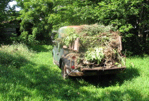 The past few afternoons have been devoted to more weed pulling. So today I took the truck and went around tossing all the various piles of pulled weeds into it. Depending on where they were and how long they'd been sitting, the piles ranged from dried out and light as a feather to sopping and decomposing. It all added up to a pile higher than the cab of the truck.