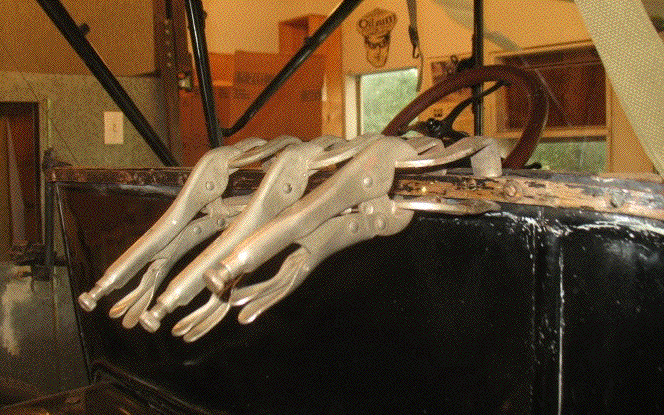 This morning I finished cleaning off the work table and set the axle housing in the fixture, ready for rebuilding. When the dealer in California was open, I called and ordered the parts. Then I turned my attention to the roadster. I needed burlap for the backrest springs, so I went to an auto upholstery shop in Winfield to buy burlap, then did some other shopping at the county seat. I ended the day putting burlap on the springs, installing them in the car, and setting the uholstery back in over the springs. Tomorrow I should get the upholstery and the top tacked back in place. That will leave a couple of mechanical chores to do, then I'll be ready to take the car for a test run.