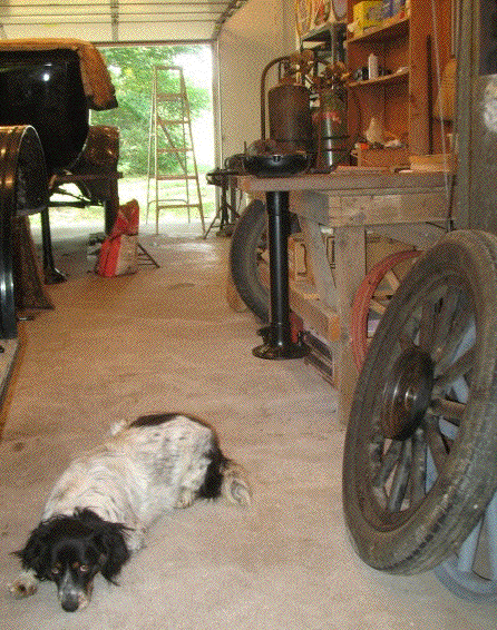 The first job of the day was to finish reinstalling the upholstery enough to use until I can get some longer tacks to attach the top. Soon after I finished that, my cousin Susie showed up with her sixteen-year-old grandson Jason, and he helped me get the car ready for a test run. Jason intalled a washer in the steering connecting rod cap as a shim to tighten up the steering, and took care of some other odds and ends while I installed the brake rods, and then we put on the rear wheels and adjusted the brakes and I put in new ball cap springs. With all that done, I started up the car, ran it out of the shop, and drove it around the yard. Everything seemed to be working OK, so I took Jason for a ride of a couple of miles. After not driving a Model T for over a year, my T driving was a little rusty, and I stalled it at a stop sign. I started it up and we headed for home, but I stopped at Dave Rademacher's to show off the new toy. When we got back I took Susie for a ride around the yard, and that was the end of the T driving for today. Here's the video: