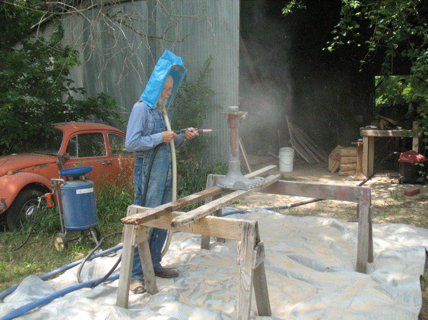At about six this morning I went out to do more sandblasting in the cool, before coming in to work on the website. The last thing I did Friday was to clean out a clog in the air pipe, and with full pressure to the blaster this morning the work went a lot faster than it did on Friday. Unfortunately, humidity has raised its ugly presence. Even with two water traps in the line, I started having moisture problems. I was able to finish piece I was doing, the left half of the rear axle housing, but that was it for the day. I took the piece to town and painted it, so now both halves are done.