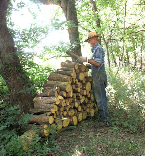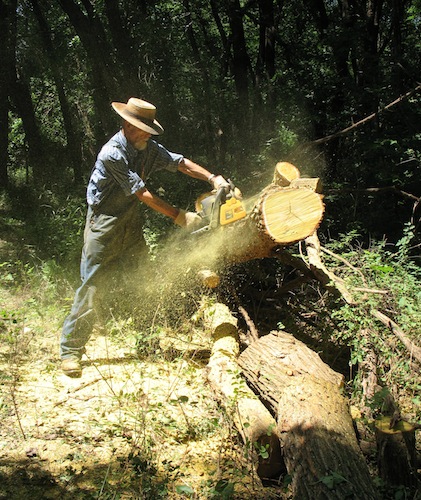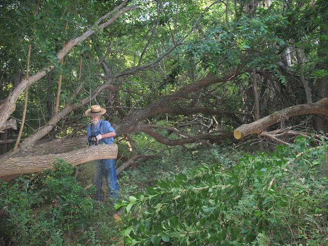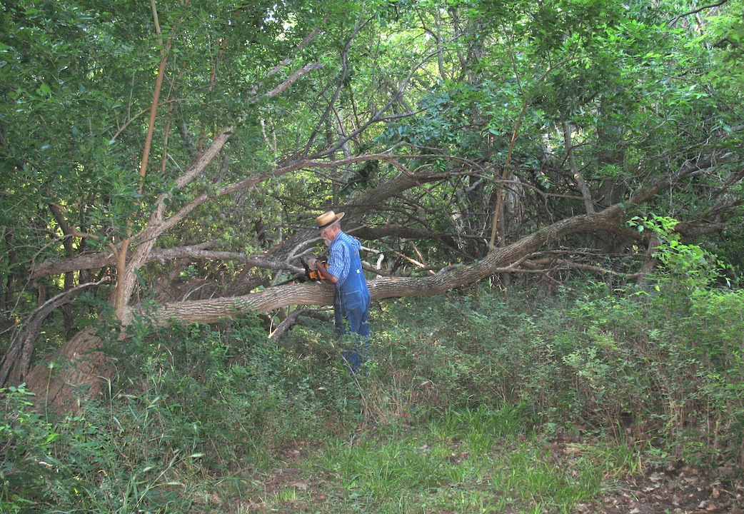 A couple of years ago a big old hedge tree fell across one of my roads. I took advantage of today's cool weather and set about clearing the road. The tree kept enough roots in the ground to stay green, so I wanted to get it cut now to let the wood dry out this summer and fall and be ready to burn this winter. Good old Osage orange is really hard stuff, and makes great fence posts that last for decades, so I'll be saving some of the branches for that. I got most of this tree out of the way, but there are still some big cottonwood branches I have to cut too. |