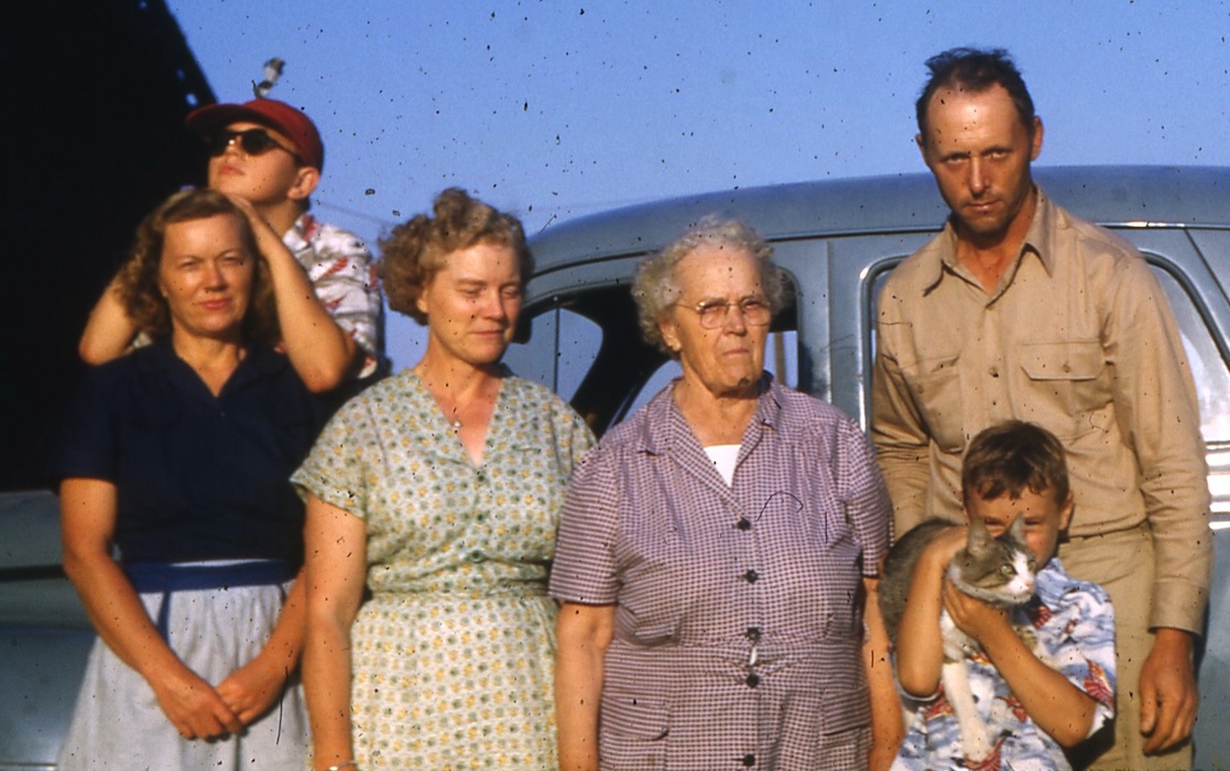 ![]() In Lomita, circa 1952: The cool dude with the shades is me. With Mom, Ernestine, Grandma, Dad, and Mike holding Stoveoil, the rare male calico. Where is Mary? She's taking the picture with her new Kodak Pony. Ages in the photo: 42, 11, 46, 79, 49, 6. 2. |