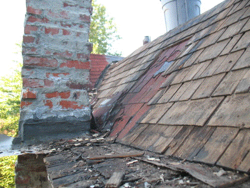 Removal of old roofing continued. Today I finished taking off the asphalt shingles and got down to the last layer, wood shingles. I got most of those off too, except behind the chimney where it's hard to pull nails. After all the shingles are off, I can start removing rotten boards and eaves, and start rebuilding.