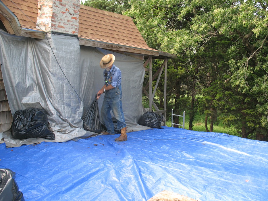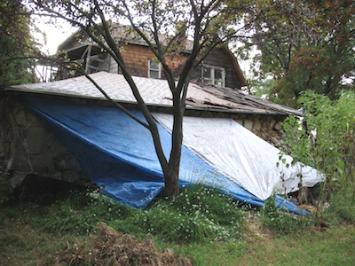 I'll have to wait for about a foot of water to dry out so I can shovel out the dirt that's fallen into the hole, so any water from the sink will go into a pail to dump in the back yard. I guess I'll do my bathing in the back yard with a hose until this is fixed. After all that digging, oh my aching back! But later in the day the sky clouded over and I finished the uncovering. My last project of the day was putting a tarp on the living room roof to stop the leaks until I get the new roofing on. I expect that will be sometime this fall when working up there is less toasty. This is the last major roof I have to fix on the house. There's also the back porch roof, but that's a mighty small one. I hope to have the outside of the house finished before next summer. |