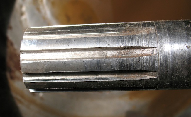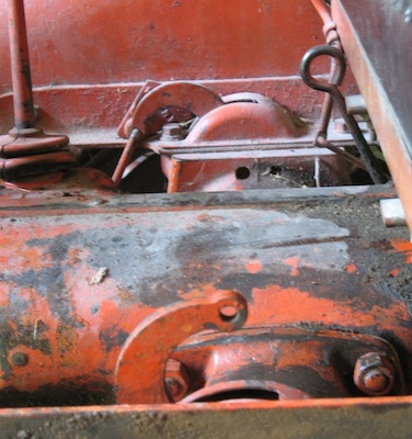 August 10, 2014 I spent the day working on the mowing tractor. It doesn't seem there's that much to do, but everything takes longer than you think it will. Cleaning all the grease off the drive shaft and making a close inspection, I found that some of the splines appeared to be mashed wide. So I did some filing and tried installation again. This time the shaft slid right into place with a little jiggling, and I had the final drive bolted in place in about five minutes. With that out of the way I set about putting everything else together. This part went slowly because of the need to wire brush the rust off of bolts and chase the threads with dies. I got the draw bar jacked into place and was putting bolts in the seat base when I noticed the brake problem. The picture shows it. The brake lever on the right side faces forward. In the foreground you see the lever on the left side is installed backwards. My first thought was that I'd leave it alone and use just the right brake until after mowing season. But looking at the shop manual, I think I can fix it now without taking too much time. |