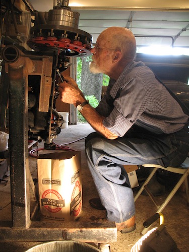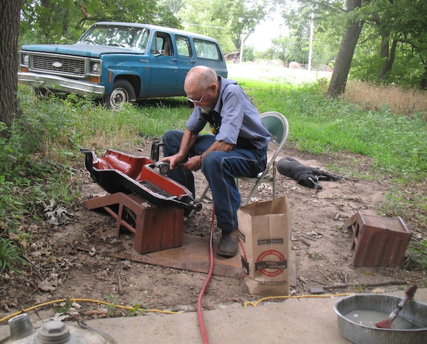 Tuesday, August 15, 2017 Taking advantage of a cool, cloudy morning, I spent an hour and a half pullling weeds. After the sun burned trough the overcast and warmed things up, I retreated to the shop. My first job there was cleaning old gasket material and sealant from the roadster's engine and oil pan so they'll be ready to reassemble after I finish with the transmission. In the afternoon I worked on the radiator, attempting to fix some leaks on both sides of the top tank. I'm letting it sit overnight with water in it, and if there are no more leaks I'll clean it up and put it back on the car. The question is whether it will stay leak free after it's subjected to the vibration and stress of drivng. |