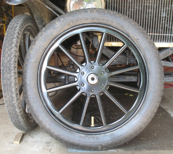 Today's project was getting the rear wheels ready to go back on the car after I get the rear axle reassembled and installed. First came washing off the oily dirt from the leaking inner seals. Next was replacing a rubber valve stem with metal. The stems I use are bigger than the ones Ford used, because they're the right size for the new brass covers to fit. Next came tire mounting. Now they're aired up and ready to put back on the car. My other job didn't go as well. Trying to put a gear on an axle shaft I broke my press. If I can't find a machine shop open tomorrow I'll have to wait until Monday to finish. |