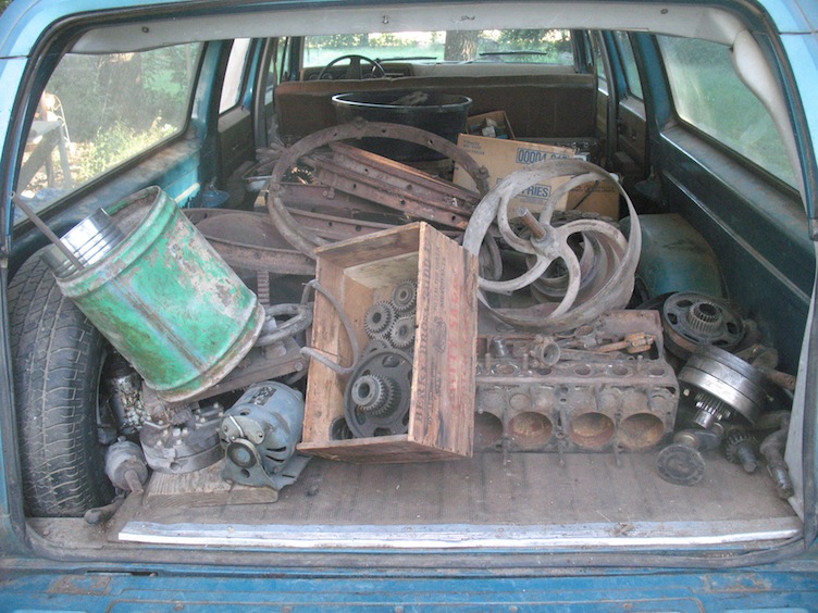 a box of transmission parts, a few generators, some line shaft pulleys,